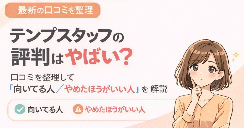 テンプスタッフの口コミ・評判を徹底紹介!良い口コミと悪い口コミの両方をまとめ、スキルチェック・面談・職場見学の実体験やよくある質問も解説。登録前に知っておきたい...